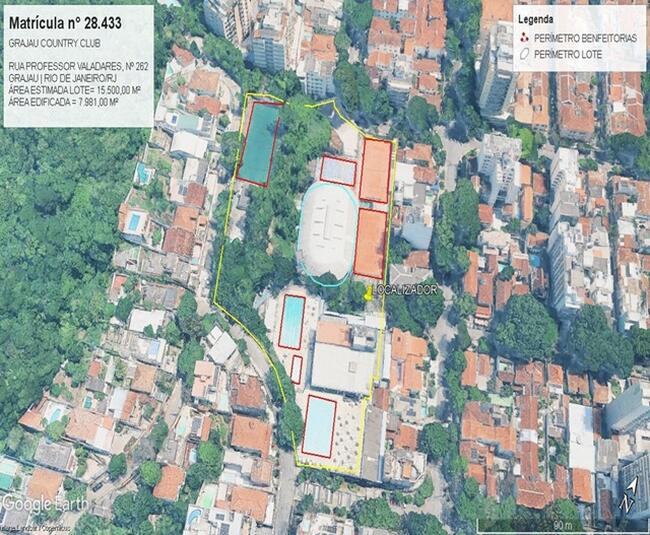 Club Esportivo, com área edificada de aprox. 7.981,00m² e terreno com área total estimada em 15.500,00m², localizado na Rua Professor Valadares, nº 262, Grajaú, Rio de Janeiro, RJ. Segundo laudo de avaliação: Trata-se de um imóvel comercial utilizado como clube social e esportivo, com as seguintes instalações: duas quadras de tênis, duas quadras de futsal, uma quadra de areia, um campo de futebol society, três piscinas (sendo duas de grande porte e uma infantil), restaurante, bar, academia, teatro, três salões de dança e três salões de festas (dois com capacidade para 250 pessoas e um com capacidade para 150 pessoas), totalizando aproximadamente 7.981,00m² de área edificada, em um terreno com área total estimada em 15.500,00m². Matrícula 28433