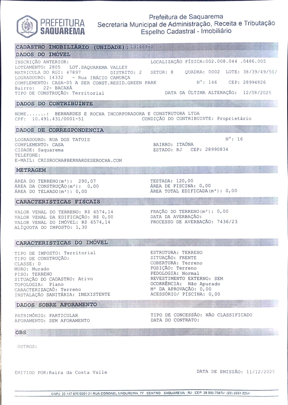 Consta junto à Prefeitura Municipal de Saquarema/RJ a existência de débitos de IPTU incidentes sobre o imóvel objeto da presente alienação, relativos aos exercícios de 2015 a 2025, perfazendo, na data de 12/12/2025, o montante aproximado de R$ 240,14 (duzentos e quarenta reais e quatorze centavos), conforme relatório municipal de débitos.